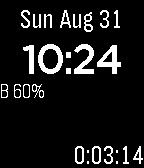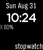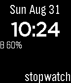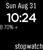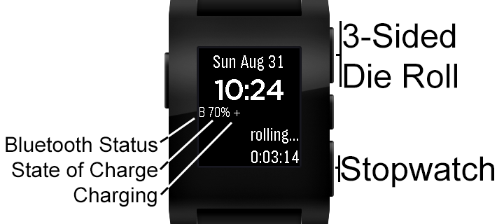 Pebble Round 2Time, stopwatch, 3-sided die and state of charge.