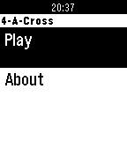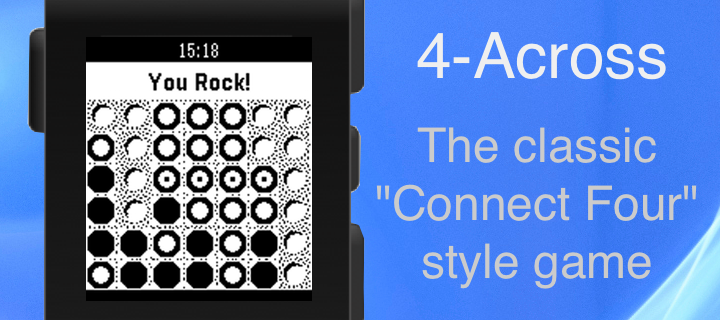 4-Across, the classic "Connect Four" style game, is now available on the Pebble Watch. The game is implemented as you against the computer on a 7x6 grid. The computer is no slouch. It knows every solution that you can play to win the game and will actively block your pursuits while also analyzing the board and taking the best position.