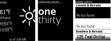 HackIllinois 2014! Combines the weather and real-time CUMTD tracking into a super-powered watch face. Fast, efficient, intuitive; A Smarter Pebble. This version will only provide bus information for my stop. UPDATE: If you go to UIUC and want a custom version that works with bus stops relevant to you, pop me an email. UPDATE2: Now open source! Let me know if you do anything cool!