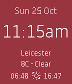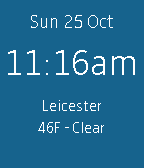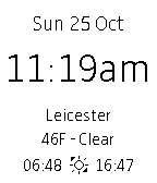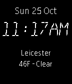 Digital watch with date, time, weather and sunrise/sunset times. Top half shows date and time. Bottom section shows weather - current town, temperature and weather description as well as sunrise and sunset times for the current location (tests run in UK GMT). Configurable views for Celsius/Fahrenheit, show sunrise/sunset, digital font and choose colours for text/background. Low memory usage. Weather retrieved every hour from OpenWeatherMap.org.