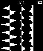 Shows continuous vertical graphs for each of the 3 accelerometer axes. Use up/down to adjust sampling rate, press select to magnify the amplitude.