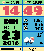 Colorful watch face with activity display, weather and BT connection status. 7 languages : Dutch, English, German, Spanish, French, Italian and Catalan. Sunrise and sunset display. Temperature in C or F, walked distance in miles or kilometers. Heartrate monitor (Pebble 2). Battery indicator included. 12-hour clock setting supported. Extremely battery friendly. 2 days free trial. Price $1,99 only!