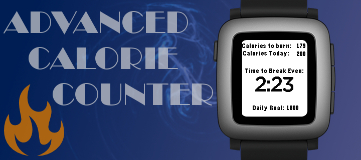 Tracking and maintaining a consistent caloric intake is one of the most effective ways to control your weight and consequently, your overall health. Inspired in part by SaltyBrains' Calorie Timer, Advanced Calorie Counter tracks Calories (kcals) over time and counts down to when you burn off Calories you've consumed. It also keeps track of your caloric intake each day. Each press of the UP button adds 50 calories to the timer (if you add too many, you can adjust with the DOWN button). - Custom daily Calorie goal sets rate of calorie burn (default is 1800) - Automatic reset of daily Calories (defaults to 5 a.m. to accommodate late night snacks, but changeable in settings) - Countdown to burning off all consumed Calories - Support for all pebble models. - Custom daily calorie goal sets rate of calorie burn - Automatic reset of daily calories (defaults to 5 a.m. to accommodate late night snacks, but changeable in settings) - Countdown to burning off all consumed calories - Support for all pebble models.