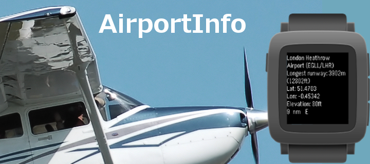 AirportInfo is the app for Pebbles that allows pilots to get information on airports. This could be their destination field, or departure field, or any other they desire. This app is also useful for querying codes/details on airports. Instructions: - Firstly, press select on the watchface screen. - Next, enter either the ICAO or IATA code of the desired airport. - Finally, read the information on-screen. Features: - Smart analogue watchface screen - Tertiary Text input method (for codes) - Full airport name - ICAO and IATA code - Runway length in ft and m - Latitude + longitude - Elevation - Distance from current position (bearing soon to come)