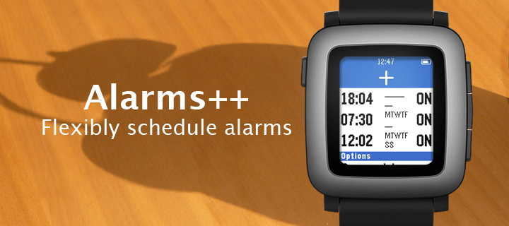 This app is open source! If you like my apps heart them in the appstore and consider a donation (link is at the source link of this app). With Alarms++ you can flexibly schedule up to 24 alarms on specific weekdays. - You could set alarms for your work days and another one for the weekend. - You can add descriptions to the alarms which will be shown when the alarm goes off. - Long-Press middle button to bring up a menu where you can disable and delete alarms - Alarms without weekdays are so-called "one time" alarms. They will ring on the next possible weekday and then deactivate themselves. - NEW: Konami-mode! Select "Dismiss alarm: hard" in the advanced settings. Now you have to press a sequence of keys during wakeup to actually dismiss the alarm (the sequence changes randomly). This should avoid dismissing the alarm accidentially. - NEW: Your next alarm is pushed as a pin to Timeline!