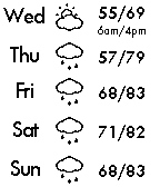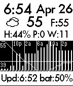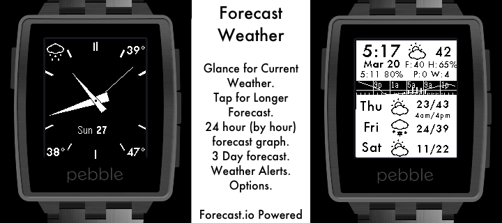 Data forecast.io API (or openweathermap.org) Analog Screen and Detail Screens Forecast for 3 days Weather Alerts Precipitation by hour for 24 hours (bar graph) Temperature trends for 24 hours (line chart) Current Weather (Temp, Pressure change,Wind speed,Feels Like Temp, Humidity)
