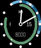 Elegant analog watch with large rings for sleep time & steps walked, indicators for date, the step counter, the battery level and the Bluetooth connection status. The outer ring shows when you were asleep and when you were in deep sleep (the darker blue segments). The inner ring shows steps walked in green, delta to average in red (if you are behind), or as a yellow dot if you are ahead. Bright green for steps over your goal.