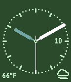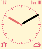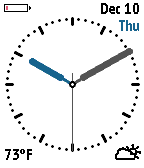 Classic watchface for Pebble Time offering additional information (complications): - battery indicator of the watch battery - date - current temperature - current weather condition Settings: - all colors - font - seconds hand visible/hide/hide at defined time - weather information via autolocation or for fixed location - interval of weather updates - vibrate on bluetooth disconnect - vibrate on full hour - display options for date and battery The dot under the watch dial indicates, that the last weather update was unsuccessful due to missing internet connection on your phone. Old weather information is displayed but updated at next update-interval (or earlier if you switch to the timeline or menu). The dot will vanish if updated weather information is displayed again. Weather information provided by Yahoo Weather. Please note that displaying the seconds handle reduces battery life because the screen has to update every second.