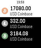 Crypto Tracker for Pebble With this app you can watch the price of Bitcoin, Litecoin, Bitcoin Cash, and Ethereum on the Coinbase Market. You will be able to choose your currency type as well. As an added bonus, you can enter a Bitcoin, Litecoin, Bitcoin Cash, Ethereum paper wallet address to track as well. The value of coin and the currency value with be displayed. If you click to select the wallet, a QR Code will appear of the wallet address. This is great for a quick receive barcode of your Bitcoin, Litecoin, Bitcoin Cash, and Ethereum Wallet. If you like this app, you can donate some BTC, LTC, BCH, ETH do the addresses below: BTC: 1D9HuDKKYY5RiMmwicV4xfuRNhVNwtmNJP LTC: LVVFkds7vYEN3yVDpXVPeMUtMYKZ8pNYbu BCH: 15FzrbwukP8VBXoLmKBYfmb8ELK5NxTtns ETH: 0xf02a22f7b4fd26264f6086c79785c80e04ed2256