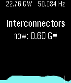 Overview of the previous 24 hours of Great British electrical power generation, using data from http://www.bmreports.com/. The present grid frequency and (known) generation output is shown at the top. The up and down buttons can be used to scroll through each generation type. Midnight is shown by the white vertical line.
