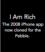 A mockup of the 2008 iPhone app "I Am Rich" which survived 24 hours on the Apple App Store before being pulled. ** Goal: 50 hearts for Aplite and Chalk support. ** COMPLETED AND UPDATED. ** New Stretch Goal: 85 hearts and I will add timeline support with daily quotes about wealth and money. ** REACHED - CURRENTLY IN DEVELOPMENT. DEV STARTED ON JAN 11 2016 AND TO BE FINISHED AT END OF JAN 2016. ** Another stretch goal: 140 hearts and I will create a "Be my Valentine" app for Valentine's Day. ** The original iPhone app had no purpose except for showing people how rich you were to be able to spend US $999 on absolutely nothing. You can now experience the original app in all its glory without paying a single cent. Simply press the select button to bring up the original message that appeared in the app and press the same button again to dismiss the message. Furthermore, the app is now on your Pebble making it even easier to show off your supposed wealth to others.