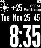 Simple watchface with big time symbols. Time, date, weekday. To enter a setup mode shake your watch. During 3 seconds current option will be displayed (sec on/off, font size, ...). If you want to apply new option value just switch to any other watchface or press menu button. When you'll switch back, new option value will be applied