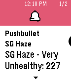 Simple app to keep track of the Haze PSI level in Singapore. The data is extracted from NEA website and is updated hourly. Click Up or Down to scroll through the regions (North, South, East, West, Central). Click Select to refresh the data. To receive instant push notification: Install PushBullet on iOS or Android to receive push notifications when PSI level reaches above 200, check out https://www.pushbullet.com/channel?tag=sghaze