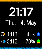 A watchface with a better battery estimate. This watchface shows (beside the Bluetooth state and the battery percentage) the time since last fully charged and the estimated running time with the current charge. It features a Pebble Time compatible color scheme for past and next events.