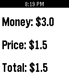 This basic change counter helps you calculate how much change you will have left. Up - Increase Your Money Down - Increase The Price Select - Calculate Change Long Press Select - Clear