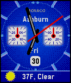 Blue Analog elegant watchface with the temperature in Fahrenheit degrees. Hours, minutes, seconds, day of the week and month, city and weather conditions with an elegant design.