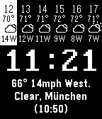 Hourly forecast is a watch face designed for daylong outdoor activities like Randonneuring! Features: -Shows temperatures, conditions, wind speeds and directions in coming 6 hours. -Moon phrase display for your night walk. -Current temperature, wind speed and gust wind info, and condition. -Current location and updated time. -Cached data for 36hrs, no need to wait for loading every time! -Manually choose your location. -Black or white colour schemes! Thanks for: https://github.com/erikflowers/weather-icons for nice icon! https://github.com/cynorg/PebbleTimely for nice example how to create an informative watch face! TTF editor for icon font: https://icomoon.io GIF editor for screenshots: http://gifmaker.me/ http://openfontlibrary.org/en/font/hanken for nice Hanken Book font!