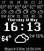 Hourly forecast is a watch face designed for daylong outdoor activities like Randonneuring! Features: Features: -Shows temperatures, conditions, wind speeds and directions in coming 6 hours. -Current temperature, wind speed and gust wind info, and condition. -Current location and updated time. -Cached data for 36hrs, no need to wait for loading every time! -Black or white colour schemes! Thanks for: https://github.com/erikflowers/weather-icons for nice icon! https://github.com/cynorg/PebbleTimely for nice example how to create an informative watch face!