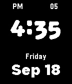 (For original Pebble) DigBlack is a nice modern digital watchface with all of you essentials right in your Pebble Watch. Displays: Month. Year. Day. Date. Battery Life. Hour (of course). Battery life is displayed by a white line representing persentage of life left.