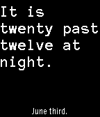 A watchface showing fuzzy time, such as "Ten to two." in complete sentences. It also shows the date in a similar manner. The time displayed is always approximate - the actual time is rounded up to the closest full five minute mark. This version shows time and date in english.