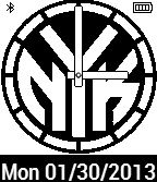An analog watchface with the Knicks logo. It also contains a battery bar and connection status. The date is displayed at the bottom