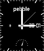 Classic watchface, featuring analog pointers, battery analog display, bluetooth icon if on and pebble logo.