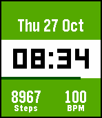 - Invert or colour options, bluetooth indicator, vibration and date format options, battery bar and level and percent, day & week number, custom text