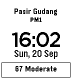 Simple watchface plus Malaysia Air Pollution Index (API) information from Malaysia Haze Watch (http://hazewatchapp.com). Top line is the nearest monitoring station, second line is the last update time. Value in the box is based on the nearest monitoring station.