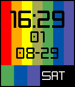 A colorful watchface based on the color test patterns shown in an era when television stations signed off in the wee hours of the morning. Shows the hour and minute, second, month, date and day of the week. Clear, crisp, and easy to read.
