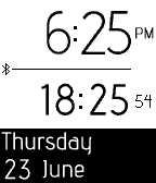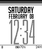 08 jan: re-added invert, cleaned up code 26 sept: added ability to show date or a colon via settings - watch vibrates on BT disconnection and a small indicator now shows if disconnected As your pebble now gives a couple of battery warnings (built-into the firmware) and there's a few separate battery apps, this just shows the time and date, using the whole screen. Works for both 12 and 24hr modes.