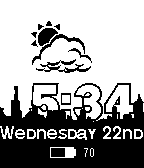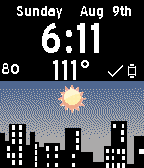 13 aug. added bogota, calgary, seattle Battery level is shown across the top in 10% increments, and when BT is lost the building windows and sky disappear and the watch vibrates. Supports 12/24hr modes. New graphics show for each weather condition. You can adjust the temp size or remove it completely. The (default) buildings are just a simple drawing - it's not any specific city. The original version can be downloaded from my website. With the latest version I've added 25 world city skylines to choose from. The city picture is NOT linked to weather or GPS.