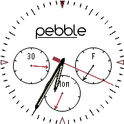 A professional Pebble watch face! The line underneath the Pebble logo indicates battery life. Left Dial - Day of the month Middle Dial - Day of the week Right Dial - Temperature For the temperature, each tick is 10 degrees If it is >100 the hand turns red, if it is <0 the hand turns blue. Please send any feedback or comments!