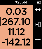 People are bad at remembering numbers. Pebble is good at always being on and displaying numbers. Use this app to count and remember up to 4 decimal numbers at a time. Don't worry about leaving to do something else with your watch, it will remember where you left off the next time you return. Use the right buttons to select which number to modify. Once you are modifying a number press the select button to switch between counting by 0.01, 0.10, 1.00, or 10.00. If you count high enough (or low enough) your number may run off the screen. Hold down the increment button or decrement button to count really fast or press and release to get a single count. Hold down the select button to reset the count to 0. Press the back button to return to selecting your number. Like all my apps, I don't want you to loose your phone so you will get a short long short vibration if your bluetooth is disconnected. An icon will show in the top left corner. Heart MultiCounter if you like it and check out Timeline and my Precisioneer watchfaces. I appreciate the hearts on those too! Counter
