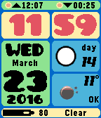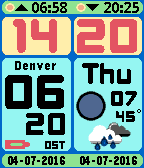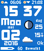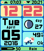 Colorful watch face with moon phase, weather and BT connection status. 7 languages : Dutch, English, German, Spanish, French, Italian and Catalan. Sunrise and sunset display. Battery indicator included. 12-hour clock setting supported. Extremely battery friendly. $3.95