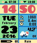 Colorful watch face with activity display, weather and BT connection status. 7 languages : Dutch, English, German, Spanish, French, Italian and Catalan. Sunrise and sunset display. Temperature in C or F, walked distance in miles or kilometers. Heartrate monitor (Pebble 2). Battery indicator included. 12-hour clock setting supported. Extremely battery friendly. Price $3.95 only!