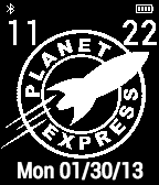 Planet Express logo with time, date, battery status and bluetooth indicator.