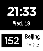Air Quality Index information bases on your current location with two watchfaces: 1) Normal time watchface; 2) AQI watchface; When AQI is higher than 150 (Unhealthy for Sensitive Groups), the watchface will be automatically changed to AQI face. Or, quickly waving your hand to switch manually. The data used for the Air Quality in this program are coming from http://aqicn.org/