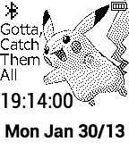 The best watch-face for pokèmon Fans! This includes Watch-Face inverting when you loose connection to your Iphone, Digital Time (Hour, Minuets, and Seconds), Date (WeekDay (eng short) Month (eng short) Date, and Year), and Battery (4 Bars). More Info: SDK: 2.0 BackGround Colour: White