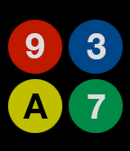 Inspired by subway signs. Time on top row (9:03), Date on bottom row (August 7). Hour in red, Minutes in blue, Month in Yellow, Day in green.