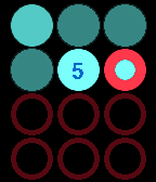 Count the blue dots to know the hours, I added a number on the last dot for easier reading. The minutes are represented by the size of the dot with the red outline. The examples read 5:30 and 10:15
