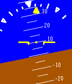 This app uses the Pebble's accelerometer to simulate an attitude indicator. The main indicator shows an artificial horizon and degrees of pitch up or down. The bank indicator at the top displays left or right tilt, with markers at 10, 20, 30, 45, and 60 degrees. By default the backlight is kept on, although it can be turned off by pressing the top right button and waiting a few seconds. Because an accelerometer is used and not a gyroscope, this app is only accurate while stopped or at a constant velocity, not while turning. I would not recommend using this for navigation anyway. ;)