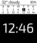 Time in text format, weather in farenheit along with text description of conditions, battery percentage, 2 week calendar view.