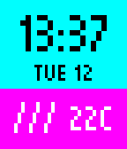 Ascii pixel weather! ( ) clear (#) partially cloudy ## overcast /// rain /!/ thunder ** snow == fog - Multiple color themes: + 14 color schemes (MSX blue, Atari red, Commodore brown, Pebble orange, DOS black, CGA tribute, DOS console, Terminal console, Turbo C IDE, Delphi IDE, Turbo Pascal, ...) + Random mode, color scheme changes every minute + Color weather (Pebble Time) (smart and dynamic color scheme, check my COLOR WEATHER watchface for more information) - Font style: + Pixelated (original watchface design) + Flat - Weather temperature units option (C, F) - Vibes on disconnect option - Day of week (spanish or english)