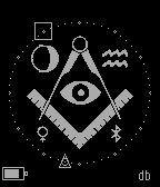 Watchface for Master Masons featuring a background of a square and compass enclosing the letter G. The analog watchface marks the hour with a square, the minute with a triangle and the seconds with a circle. When the seconds marker (circle - mercury) coincides with the minute marker (triangle - sulfur), the G becomes an eye. When the seconds marker coincides with the hour marker (square - salt), the G becomes an uroboros. The current lunar phase, sun sign, the planet associated with the current day of the week, the bluetooth status and battery levels are shown without text or numbers achieving a practical but purely symbolic watchface. The watchface vibrates on bluetooth disconnect.