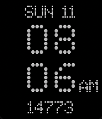 A minimalist Pebble watchface with a distinctive pixel-grid aesthetic. Time, Date, Step Tracker, Weather and Battery Indicator. Access settings through the Pebble app: - Color Options: Background, foreground, and secondary colors fully customizable - Step Goal: Set target steps (default: 8,000) - Display Toggles: Show/hide steps, battery, and date - Time Format: 12-hour or 24-hour display - Date Line: Make your combination with - Redesign Date line, now you can customize left/right side information. - Added option are month name, weekday name, year, week of the year, month, day - Load Animation: Pick a load animation: None, Wave Fill, Random Pop, Matrix