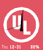A colorful analog watch face using the Underwriters Laboratories logo - complete with the date and remaining battery percentage.