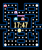 Pac-Clock is a fully playable Pac-Man watchface for Pebble. Guide Pac-Man through a classic maze by tilting your watch — forward, back, left, or right to change direction. The current time is displayed in the center of the maze.
