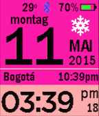 Great animated pebble face that show the date in a big format, as well the time including seconds in 12h/24h format and the possibility to add a secondary clock (Not timezone, just add or subtract to the actual time). Show the current Temperature (Fº or Cº) using GPS or just typing the name of the city you want (powered by Yahoo Weather), and condition icons. Also have a very usefully animated battery indicator on the right-top of the screen, never get discharge your Pebble again. Bluetooth icon for connection/disconnection (vibes on disconnect) Multilingual clock by settings in the Pebble app of the Phone and more cool stuffs. More info: http://youtu.be/rMviK6940d4