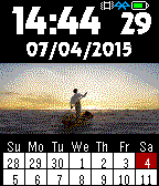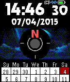 Cozumel beach scene Features a 2 week calendar, and when you shake or tap, see a 5 day weather forecast. Tap again for sunrise, sunset and moon phase. Tap a third time for a compass! After 15 seconds, the screen will revert to the default page.