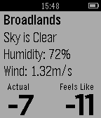 Gets current weather stats for current location. Update: Added choice of wind speed units in app config. Displays: Closest location weather data was retrieved from Description of weather Humidity Wind speed Temperature (nice and big) Apparent Temperature (what it really feels like) Default is Celsius, but can you change this in this apps config after installing it. If you have any suggestions, requests, recommendations feel free to email me! I welcome ideas. (Feel free to contact me to add more weather providers and I'll see what I can do) I made this app because I wanted a weather app to access from the app list, which was not a watch face, and was ONLY for weather. This way my main pebble watch face can be only for time.